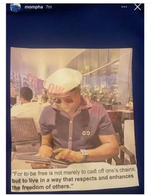 Mompha shared photos of himself thinking about his freedom gained from the EFCC saying to be free is not merely to cast off one’s chains but to live in a way that respects and enhances the freedom of others.