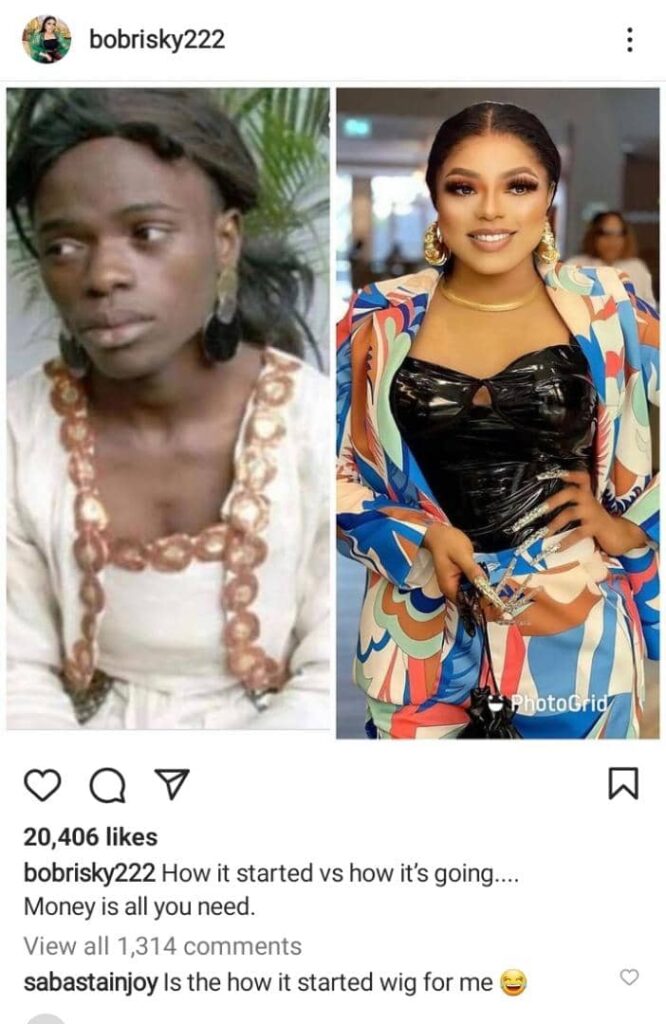 Popular Cross dresser Bobrisky sharing a throwback photo of himself to show how it all started with the journey from being a man to the beautiful woman he is today said all you need is money.