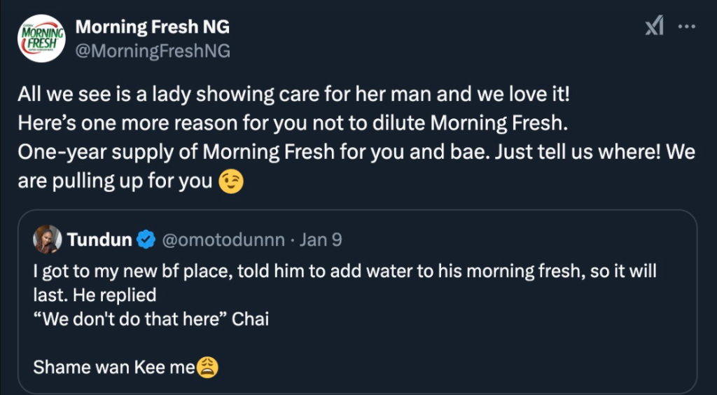 “All we see is a lady showing care for her man, and we love it! Here’s one more reason for you not to dilute Morning Fresh. One-year supply of Morning Fresh for you and bae. Just tell us where! We are pulling up for you 😉.”