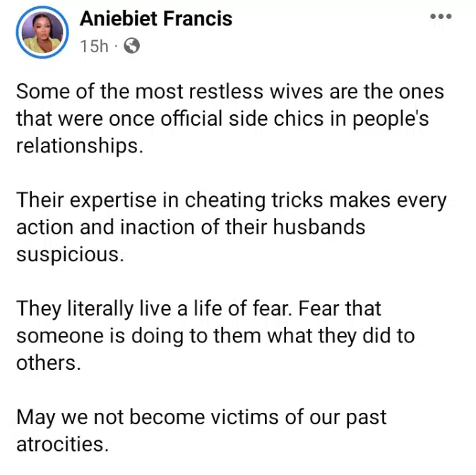 Aniebiet Francis, a Nigerian actress, believes that most restless wives who are constantly suspicious of their husbands’ behaviors and inactions were once side chicks in other people’s relationships.