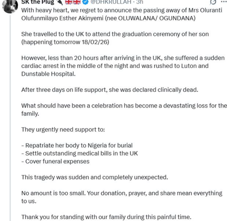 According to social media user SK the Plug, Mrs. Akinyemi arrived in the UK on February 11, 2026, for her child’s graduation ceremony scheduled for February 18. In the early hours of February 12, she reportedly collapsed and was rushed to Luton and Dunstable Hospital.