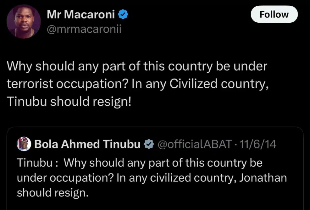 Mr. Macaroni, known for speaking out on national issues, accused the government of failing in its basic duty to protect lives. He also questioned why, despite repeated promises, certain regions remain under the grip of terror groups.