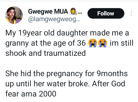 “My 19 year old daughter made me a granny at the age of 36. I ‘m still shook and traumatized. She hid the pregnancy for 9 months up until her water broke. After God fear ama 2000,” she disclosed in a post on Wednesday, March 27, 2024.