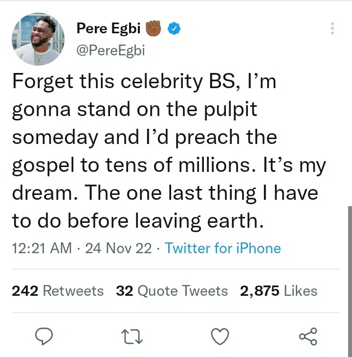 Big Brother Naija ‘Shine ya eyes’ housemate, Pere Egbi, has revealed plans to preach the gospel and venture into ministry.