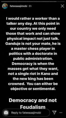 Governor Abdullahi Ganduje’s daughter, Fatima took to her Instastory to make a direct comment on the dethronement of Sanusi Lamido Sanusi as the Emir of Kano.