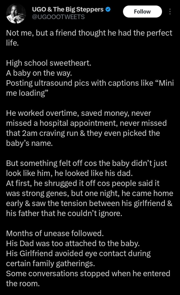 He said the father became overly attached to the pregnancy, while the girlfriend avoided eye contact during family gatherings. Conversations would reportedly stop abruptly whenever the man entered a room, raising further suspicion.