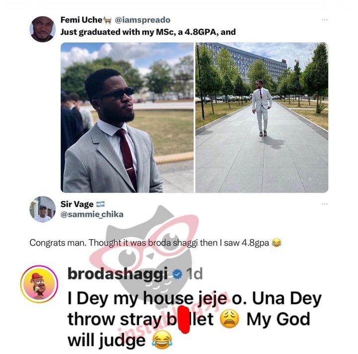 “Congrats man. Thought it was Broda Shaggi then I saw 4.8gpa”.