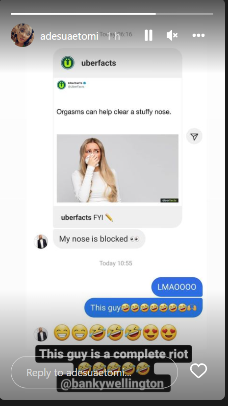 Banky had sent Adesua a screenshot of a weird fact posted by ‘Uberfacts‘ which disclosed that orgasms help clear a stuffy nose.