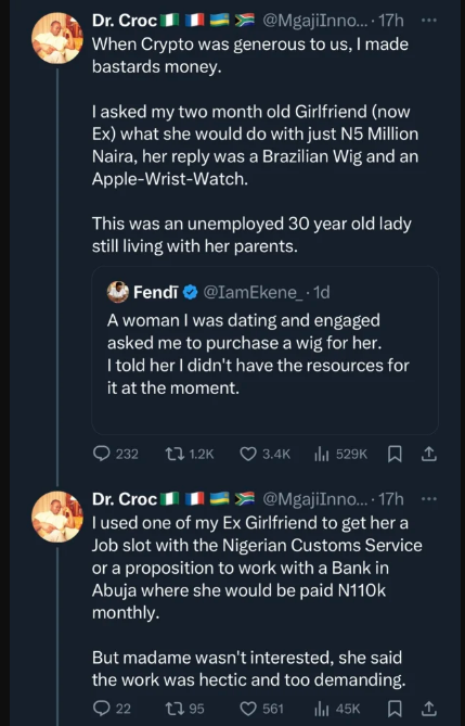 On social media, a young man recalled how his thirty-year-old, unemployed ex-girlfriend wanted to spend N5 million on an Apple Watch and a Brazilian wig.