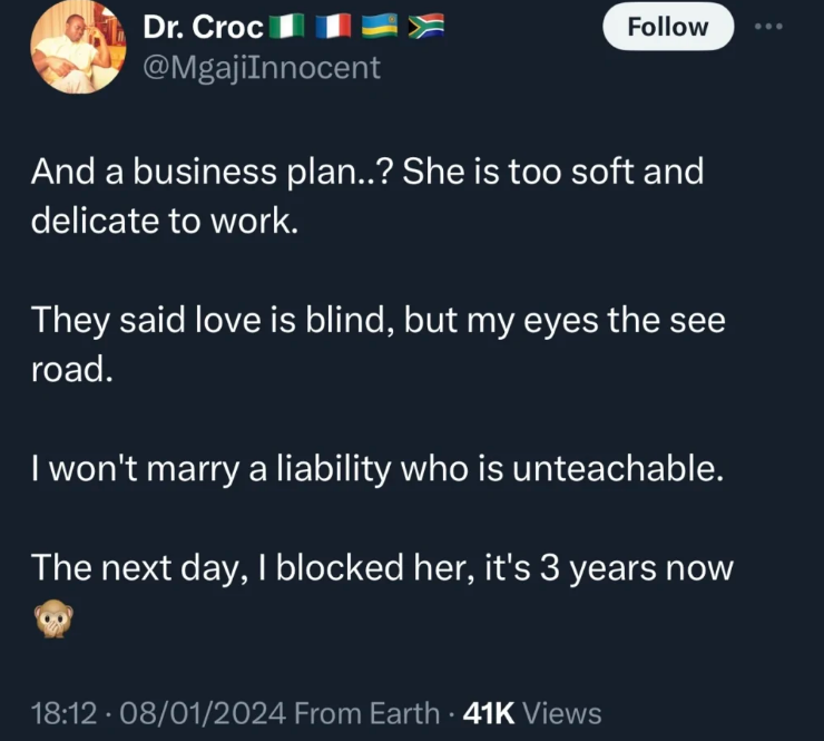 The man posted this information on Twitter under the handle @MgajiInnocent, where other men were discussing their dating experiences with other ladies.