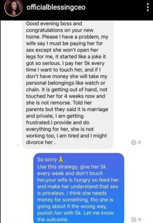 “I have a problem. My wife say I must be paying her except she won’t open her legs for me. It started like a joke till it got so serious. I pay her N5k every time I want to touch her.
