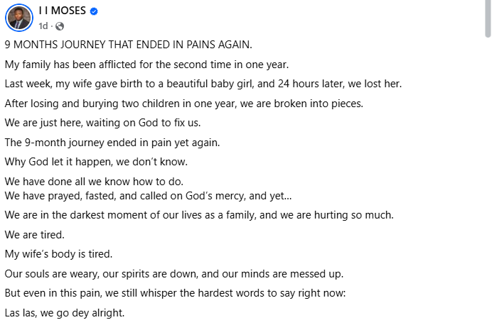 Reflecting on the emotional toll, Moses admitted that both he and his wife feel shattered and are relying on God for healing. In his heartfelt post, he explained that they have exhausted every effort praying, fasting, and seeking divine mercy yet are still grappling with profound grief.