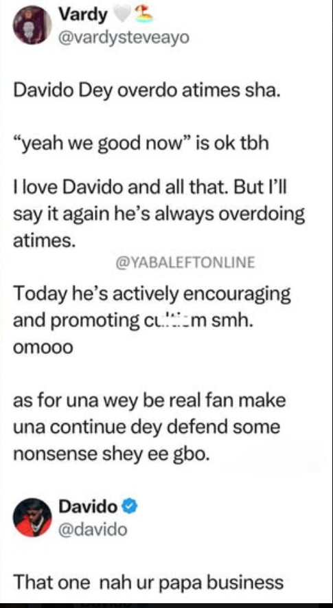 A user identified as @vardysteevayo took to X (formerly Twitter) to criticize Davido, claiming the singer was “overdoing things” and “actively promoting cultism.”