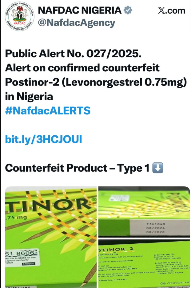 The National Agency for Food and Drug Administration and Control (NAFDAC) has issued a warning about counterfeit Postinor-2 (Levonorgestrel 0.75mg) being sold in Nigeria.