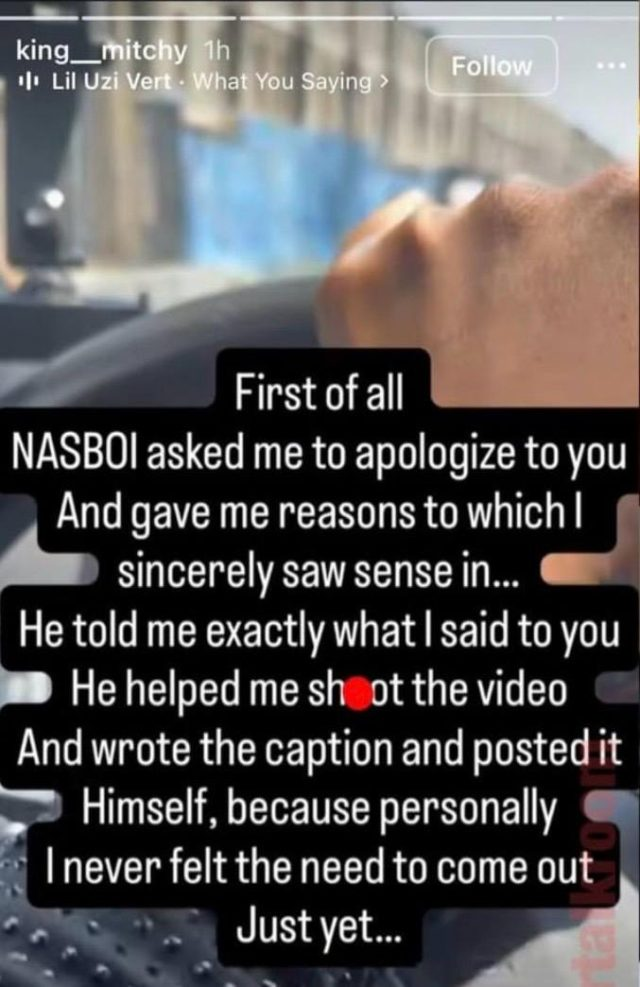 In an open post, King Mitchy shared that Nasboi advised her to apologize, providing reasons she found reasonable. She revealed that he even scripted her statement, assisted with filming the video, drafted the caption, and published it on her behalf, as she had not initially intended to address the matter publicly.