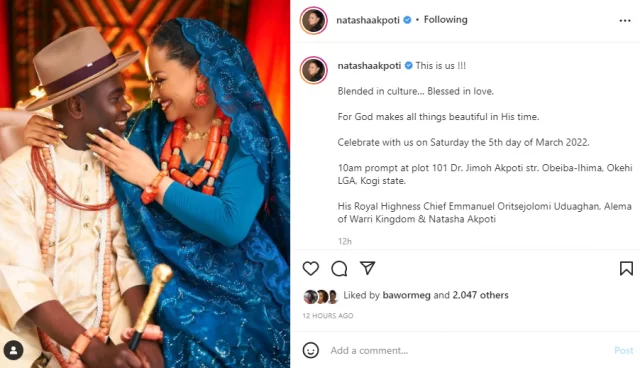 She wrote: “This is us !!! Blended in culture… Blessed in love. For God makes all things beautiful in His time. Celebrate with us on Saturday the 5th day of March 2022.