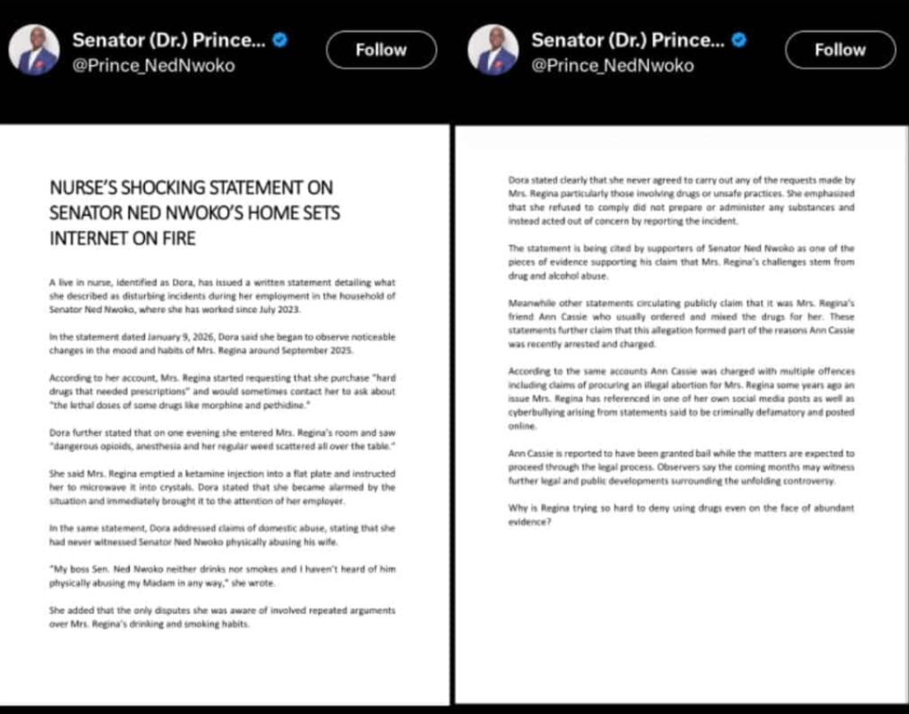 Nigerian senator Ned Nwoko has sparked fresh controversy after sharing allegations made by one of his household nurses against his wife, actress Regina Daniels.