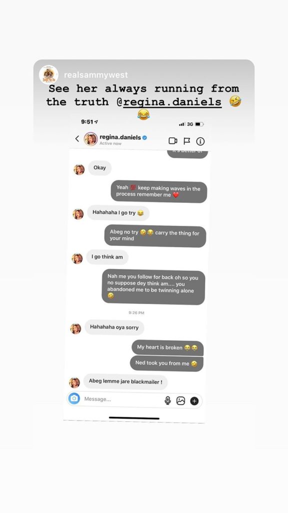 Nigerian actress, Regina Daniels has taken to Instagram to share a screenshot of her chat with her brother, Samuel Daniels.