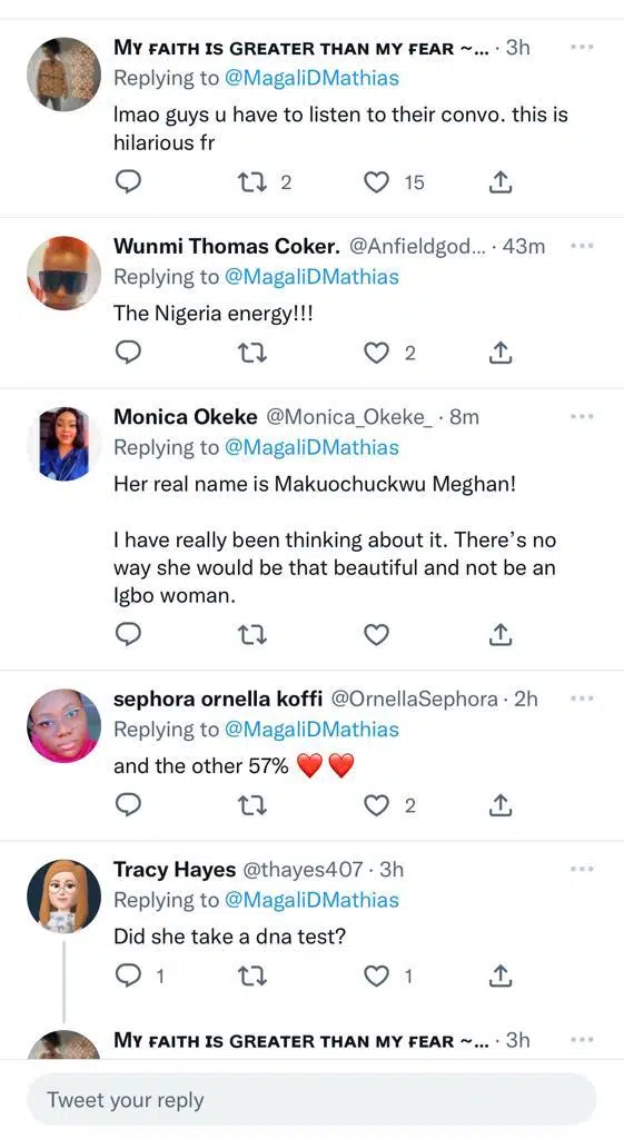- The Duchess of Sussex says that she will continue to dig deeper as everyone she has told, especially Nigerian women “are like What!”