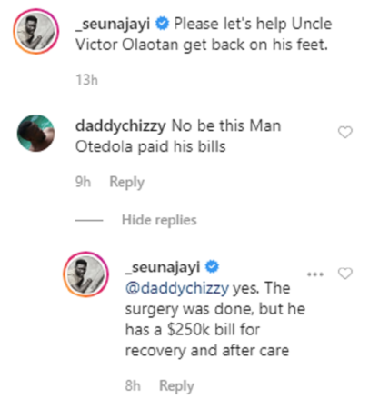 Victor Olaotan’s colleagues have now taken to social media to solicit for support to get him back on his feet. Actor Seun Ajayi who acknowledged that Femi Otedola paid the veteran actor’s medical bill, said he (Olaotan) needs $250k for recovery and after care.
