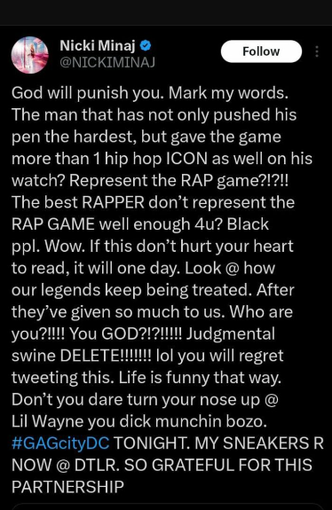 Minaj argued that, given Lil Wayne’s significance to New Orleans and his influence on the hip-hop genre, he would have been the ideal choice for this prestigious event, considering he is the head of Young Money Records and her mentor.