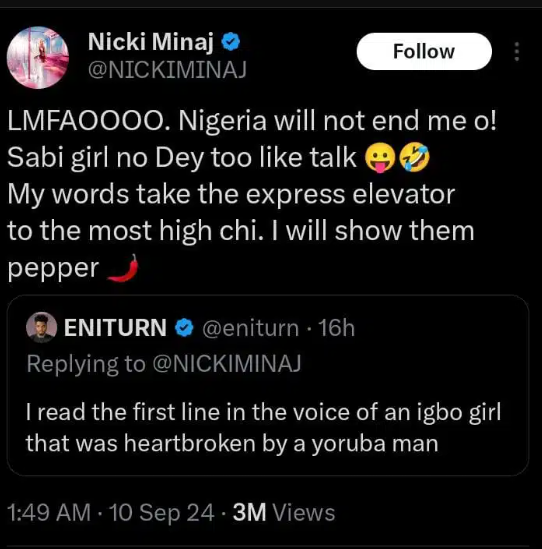 - Nicki Minaj, an American rapper, has stated in a recent tweet that Nigeria will not be her end.