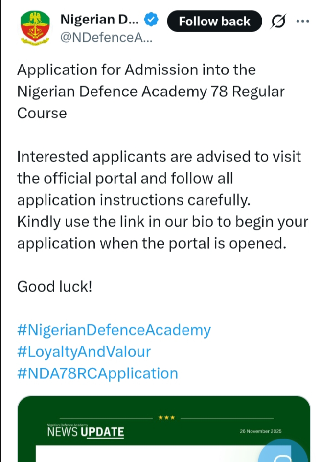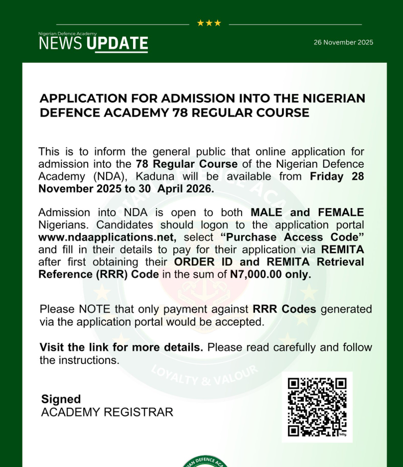 The Nigerian Defence Academy (NDA) has officially announced the opening of its online application portal for admission into the 78 Regular Course. The portal will open on Friday, November 28, 2025, and will close on April 30, 2026.