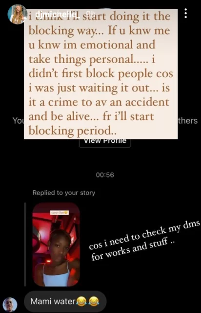 “I think I will start doing it the blocking way. If you know me u know I ‘m emotional and take things personal. I didn’t first block people cos I was waiting it out. Is it a crime to have an accident and be alive?” she wrote.