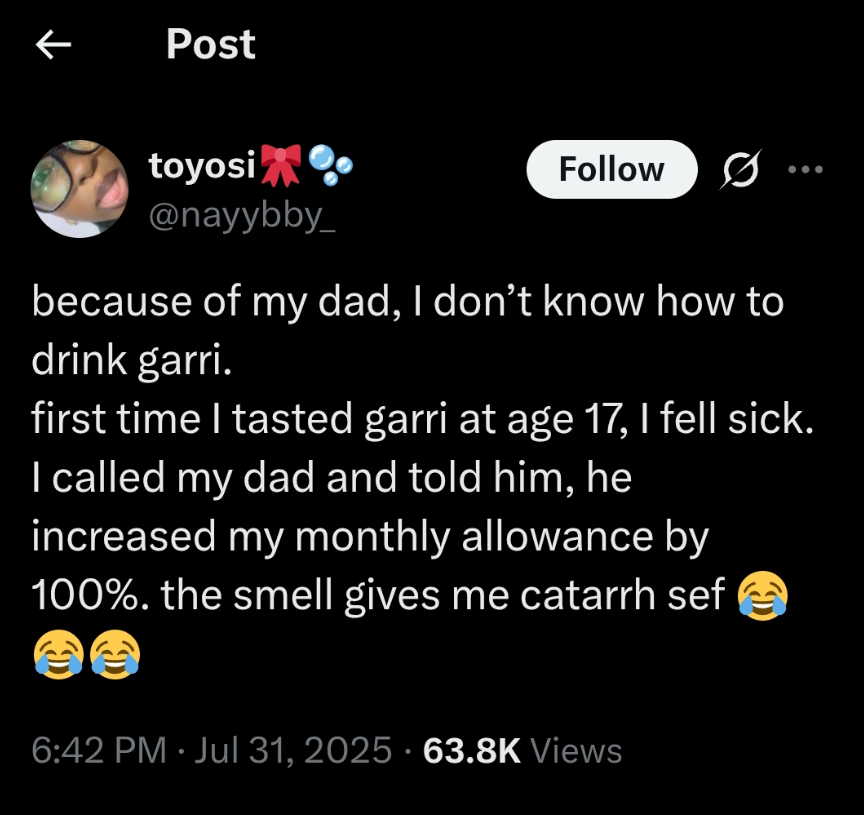 The story was posted on X (formerly Twitter) by user @nayybby_, who revealed that her father never introduced her to garri while growing up, so she had no experience with it until recently.
