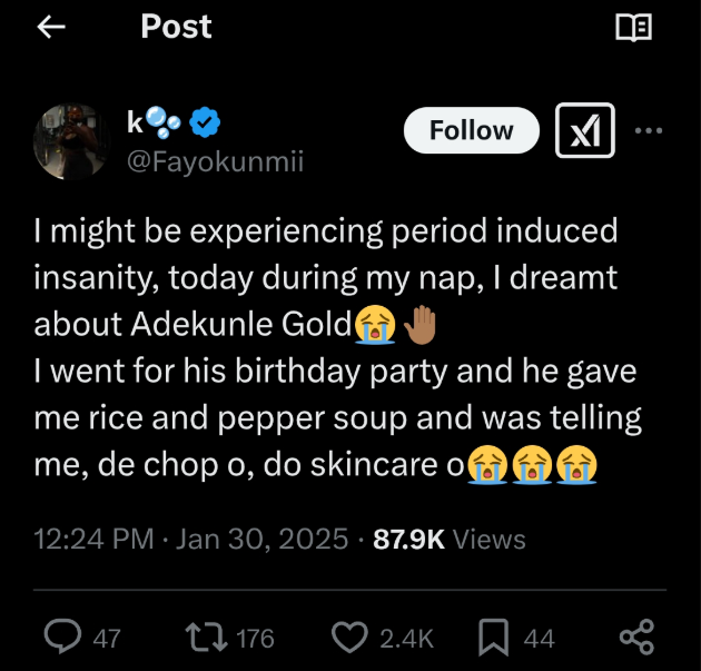 Detailing her dream, she wrote: “I might be experiencing period-induced insanity. Today during my nap, I dreamt about Adekunle Gold😭🤚🏾. I went for his birthday party, and he gave me rice and pepper soup while telling me, ‘De chop o, do skincare o😭😭😭.”