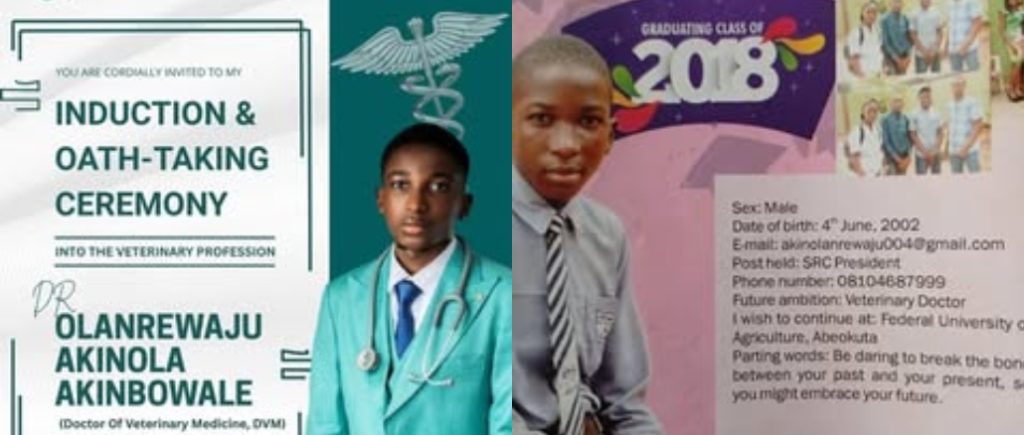 A young Nigerian man, Olanrewaju Akinola Akinbowale, has melted hearts online after fulfilling the dream he boldly declared back in secondary school — to become a Veterinary Doctor.