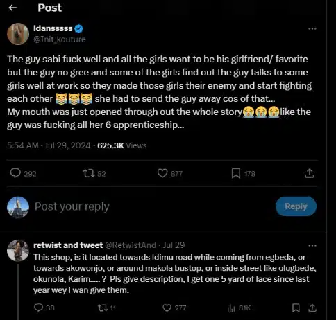 The guy sabi fxxk well and all the girls want to be his girlfriend/ favorite but the guy no gree and some of the girls find out the guy talks to some girls well at work so they make those girls their enemy and start fighting each other 😹😹😹 she had to send the guy away cos of that. My mouth was just opened throughout the whole story😭😭😭like the guy was fucking all her 6 apprenticeships…