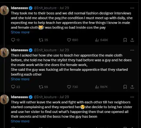 Then I asked her how she use to teach her apprentice the male cloth before, she told me how the stylist they had before was a guy and he does the male work while she does the female work, She said the guy was fucking all the female apprentice that they started beefing each other at work and usually do anyhow they like while she is not at work😭😭those girls won’t do the work they are supposed to do..