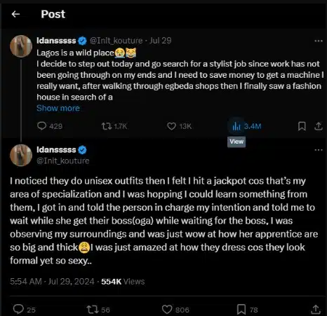 The narrator mentioned that she went looking for a stylist job in Lagos’ Egbeda sector and came across a unisex fashion firm that she liked.