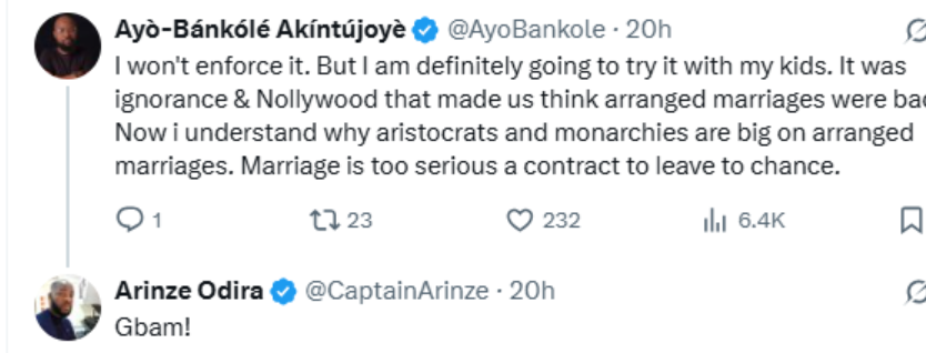 His comments have sparked conversations online, with many Nigerians debating whether arranged marriages remain relevant in today’s world or if young people should be left to choose their own partners independently.