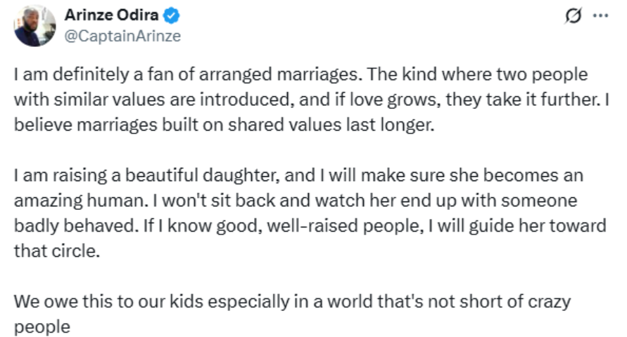 Nigerian pilot, Arinze Odira, has openly declared his support for arranged marriages, stressing that he will ensure his daughter ends up with a well-raised partner.