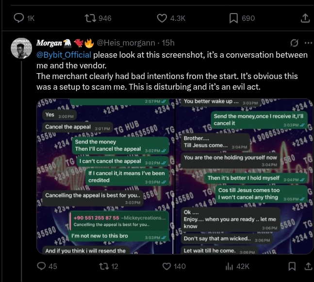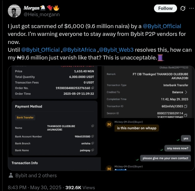 “I just got scammed of $6,000 (₦9.6 million) by a @Bybit_Official vendor. I’m warning everyone to stay away from Bybit P2P vendors for now.”