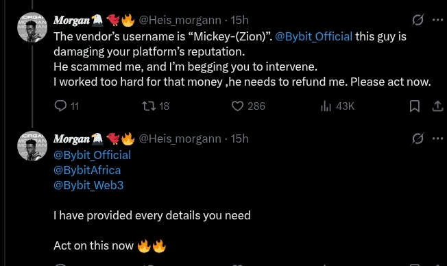 The vendor’s username is “Mickey-(Zion).” The victim pleaded with Bybit: “@Bybit_Official, this guy is damaging your platform’s reputation. He scammed me, and I’m begging you to intervene. I worked too hard for that money; he needs to refund me. Please act now.”