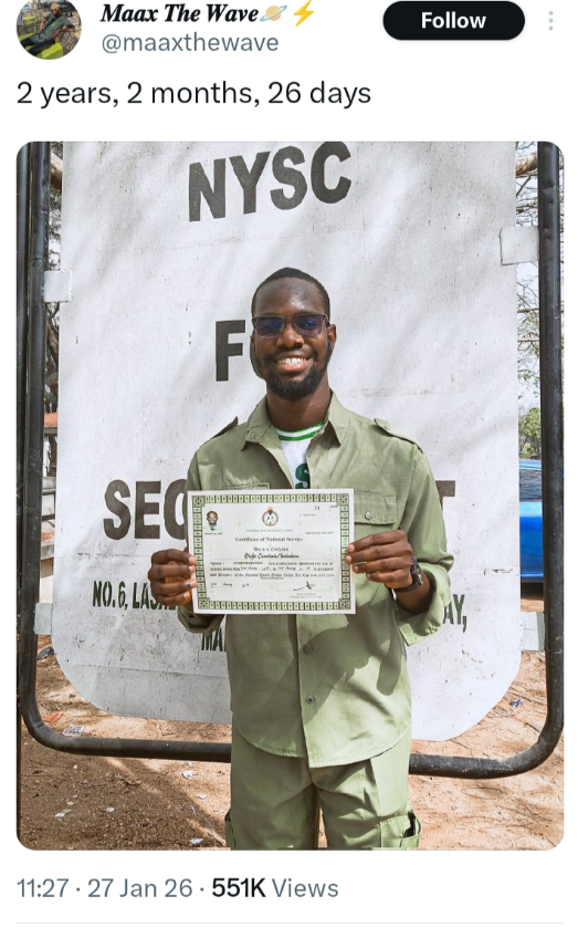 The man, identified on X (formerly Twitter) as @maaxthewave, reflected on his experience while celebrating his successful passing out from the compulsory national service scheme.