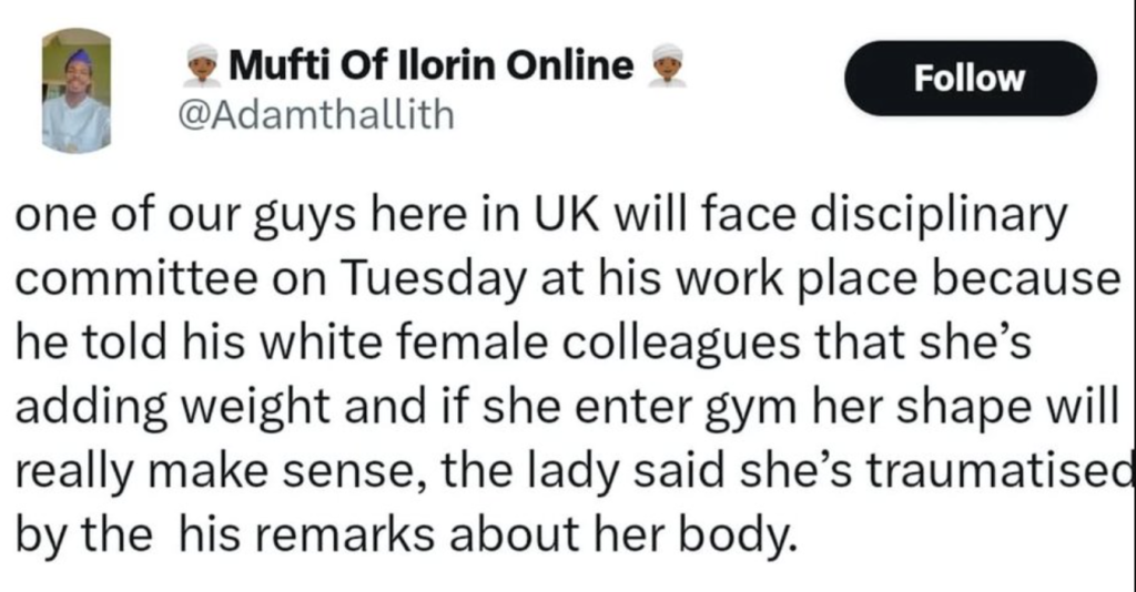 According to popular Twitter user, Mufti of Ilorin Online, the man allegedly told his colleague that she was “adding weight” and suggested that if she entered the gym, her shape would make more sense. The woman, clearly upset, reported the comment, saying she felt traumatised by the remarks.