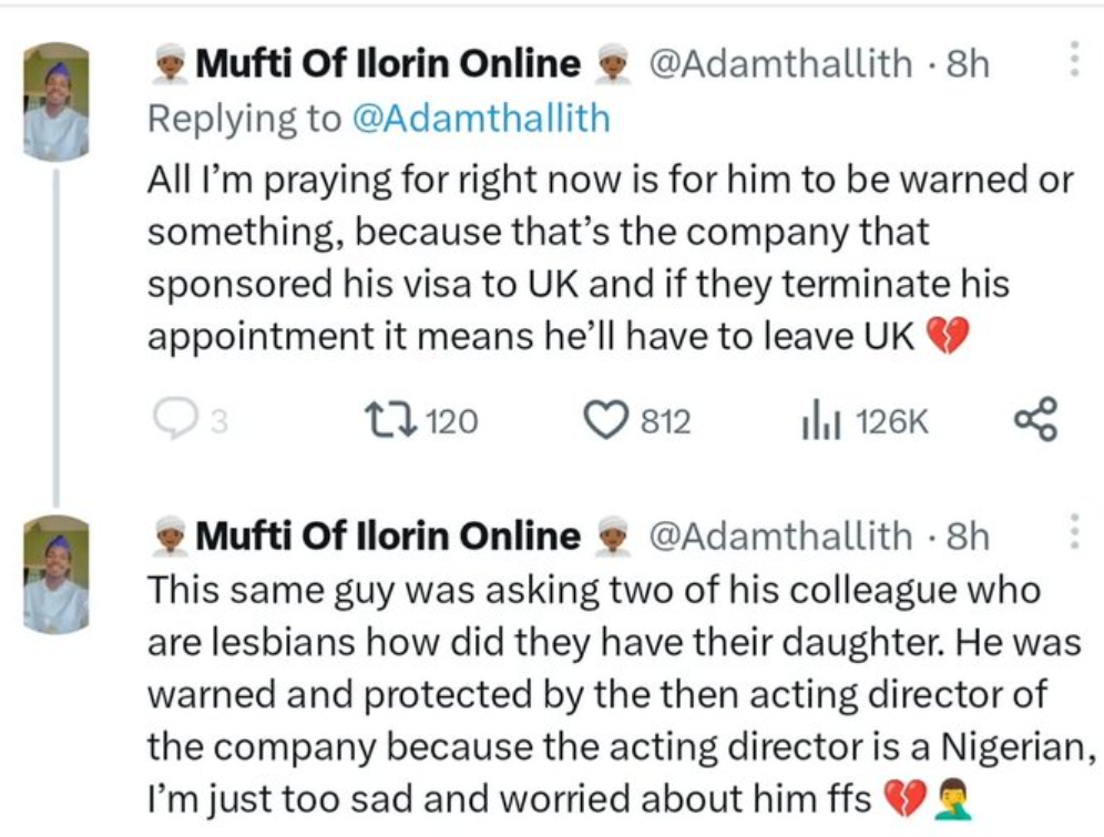 To make matters worse, this isn’t the first time the man has found himself in hot water at work. According to Mufti, he previously questioned two lesbian colleagues on how they had a child together, a move that also almost got him in trouble. He was only spared then because the acting director at the time — a fellow Nigerian — intervened on his behalf.