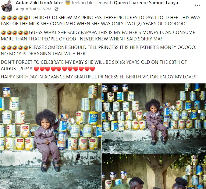 A Nigerian man named Autan Zaki IkonAllah recently shared on social media the large tins of milk his daughter, El-Berith, drank when she was only 2 years old.
