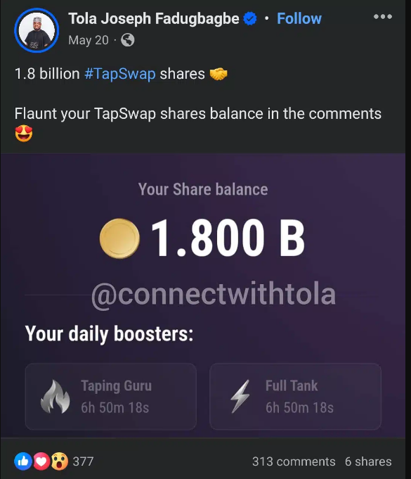 The man, known as Tola Joseph Fadugbagbe, posted a screenshot of his TapSwap balance on his Facebook page and encouraged others to do the same.