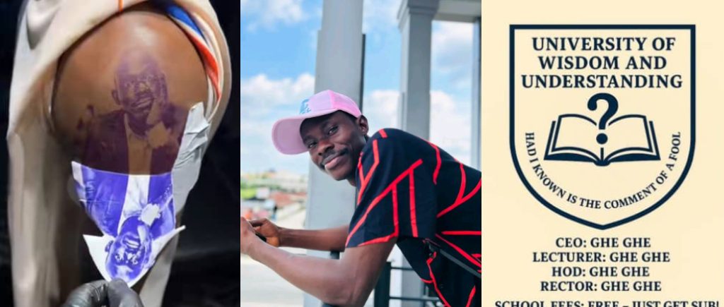 - A Nigerian man tattooed online personality GheGhe on his arm after claiming to graduate with a first-class degree from the “University of Wisdom,” an online platform teaching men about women and relationships. GheGhe is yet to respond to the gesture.