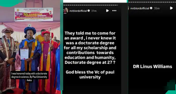 “They told me to come for an award, I never knew it was a doctorate degree for all my scholarship and contributions towards education and humanity, doctorate degree at 27? God bless the VC of Paul University,” Blord wrote.