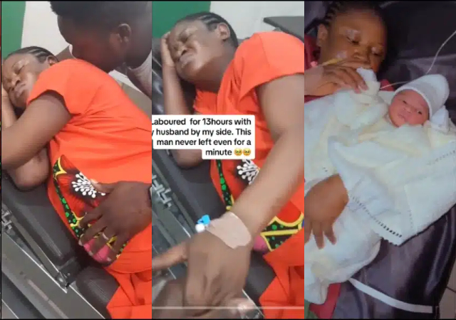 A wife who gave birth to her adorable child after a 13-hour labour expresses gratitude to her husband for never leaving her alone during her labour.