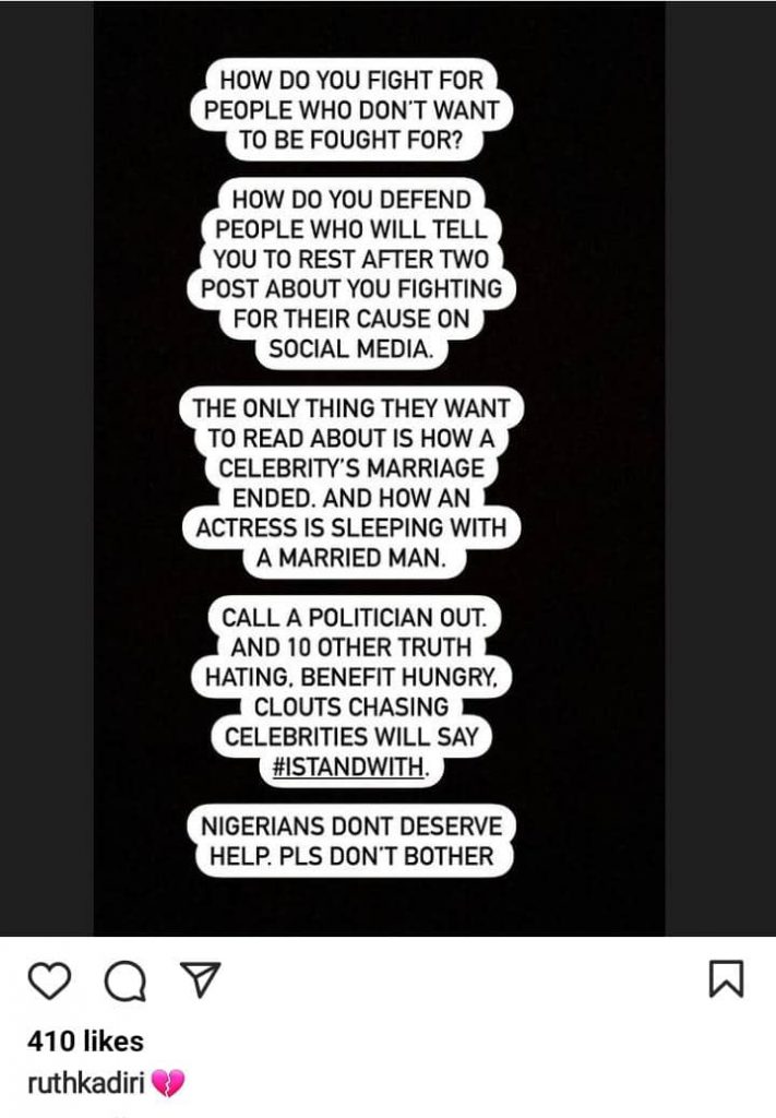 Ruth Kadiri posted asking how do you fight for people who don’t want to be fought for and how do you defend people who will tell you to rest after two posts about fighting for their cause on social media making it look as if you have nothing important doing to be fighting for them when they themselves are not interested in fighting for their rights.
