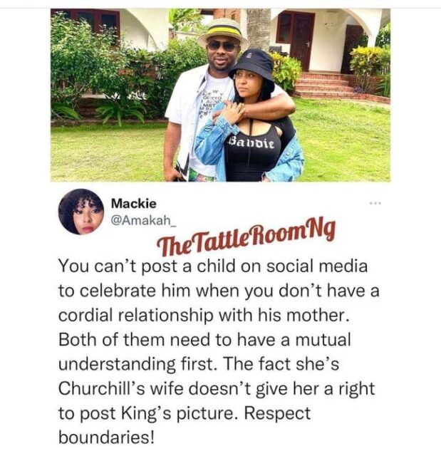 The actress joined her husband Olakunle Churchill to celebrate his first son King Andre on his birthday wishing him God’s blessing to overcome every dusk, and a netizen reacting to that thinks it’s wrong of her to have done that.