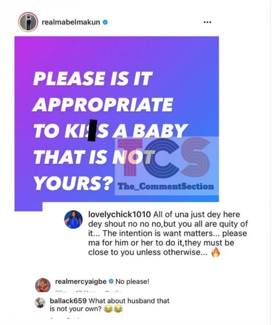 In a post shared on her Instagram page, Mabel Makun questioned her followers if it was appropriate for a person to kiss a baby that does not belong to them.