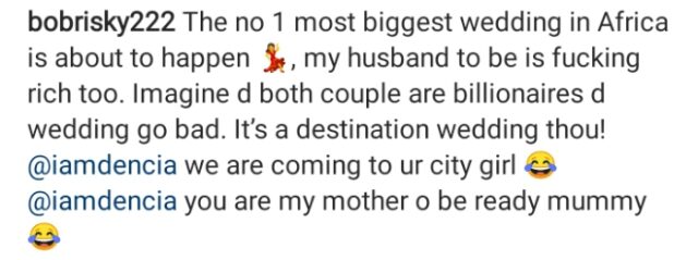 “The no 1 most biggest wedding in Africa is about to happen, my husband to be is fucking rich too. Imagine d both couple are billionaires d wedding go bad.